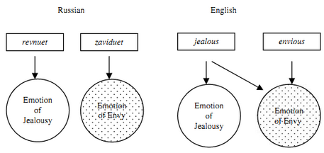 On the whole Russian speakers tend to apply term “zaviduet” only to “envy situations” and “revnuet” – only to “jealousy situation”. English speakers refer to “envy situations” with the both words (“envy” and “jealous”) almost equally, though still differentiating between their appropriateness in “jealousy situations”. |